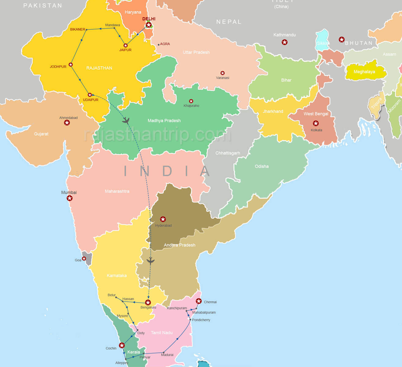 After a full-day sightseeing tour of Old and Delhi, drive to Jaipur, the capital city of Rajasthan and popular as the 'Pink City'. Explore the attractions of the Rajput era, and then drive to the village of Mandawa to view stunning havelis (mansions) and fresco paintings. Visit the 'Land of Camels' – Bikaner. See the Mehrangarh Fort and the Jaswant Thada in Jodhpur. Make a visit to the Jain Temples of Ranakpur before reaching Udaipur, the 'City of Lakes'. Fly to Bangalore, the capital city of Karnataka, to view colourful gardens, palaces and temples. Explore Hassan, Belur and Halebid, famous archaeological sites. Visit Mysore and Ooty before stepping into the state of Kerala where you'll visit places like Alleppey and Periyar. Drive to Madurai to view popular temples of southern India. Visit Pondicherry, Mahabalipuram and Kanchipuram before getting to Chennai for more sightseeing.