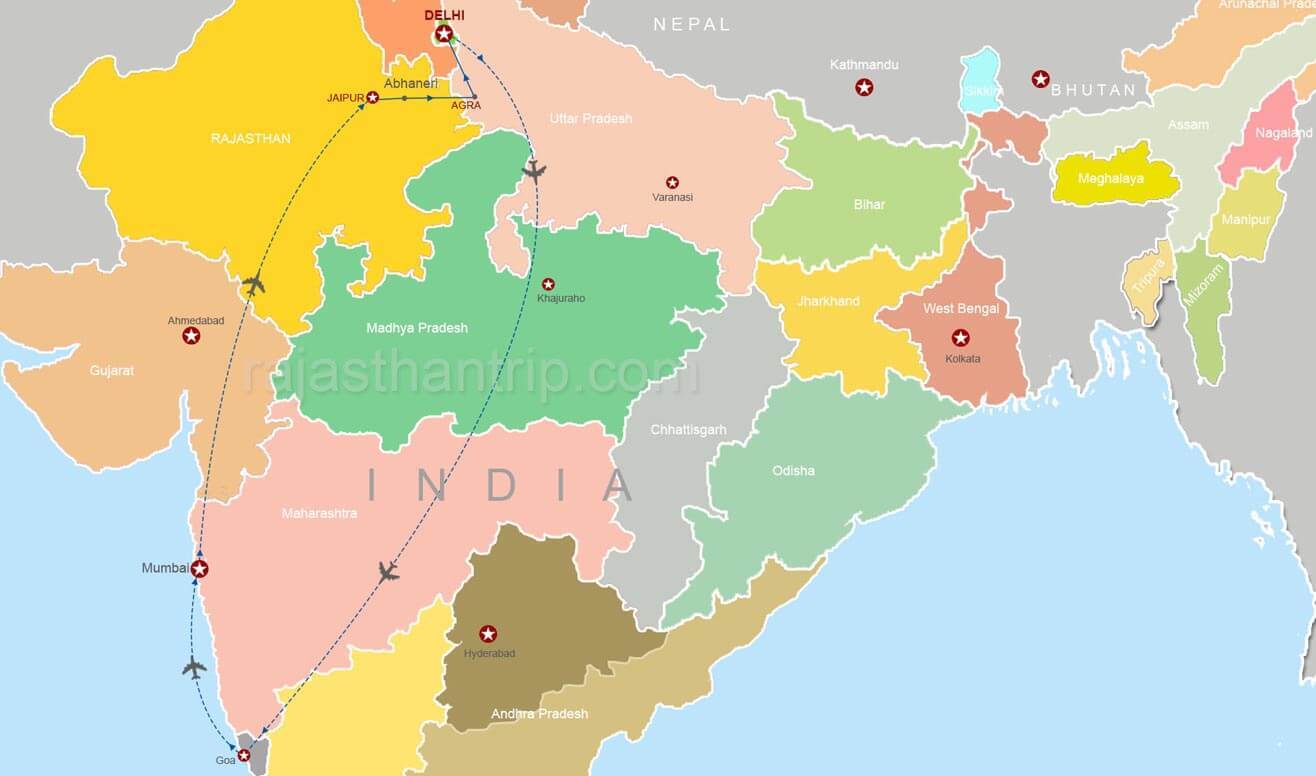 Begin with a wonderful sightseeing tour of Mumbai, the financial capital of India. See the Gateway of India, the Elephanta Caves and the Prince of Wales Museum. Fly to Jaipur, the capital city of Rajasthan. Explore the tourist attractions and the colourful bazaars of this 'Pink City'. Drive to Agra to experience the eternal beauty of the Taj Mahal and witness the monumental structure of the Agra Fort. Drive to Delhi to explore both Old and New Delhi before flying to Goa where you'll see pristine beaches and beautiful churches. Get back to Delhi or Mumbai for your flight back home.